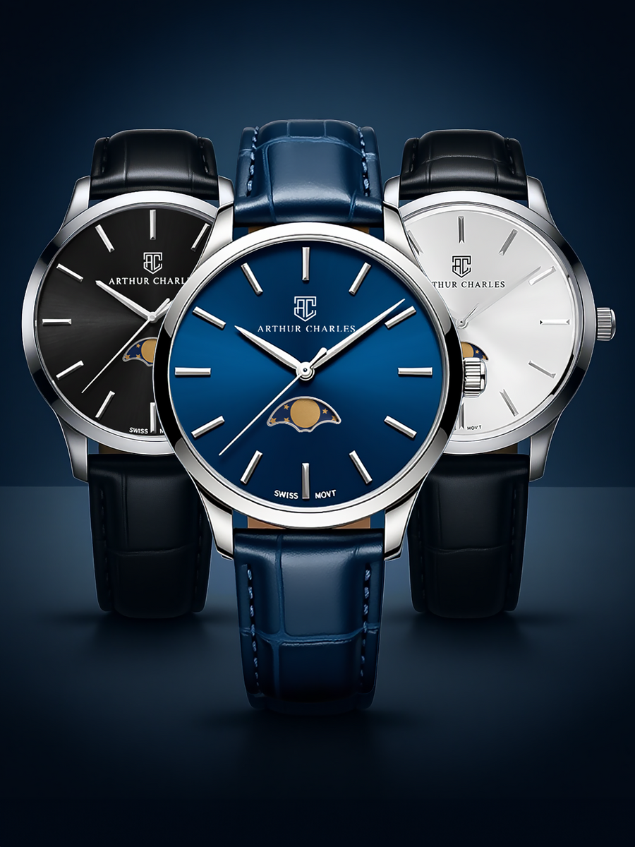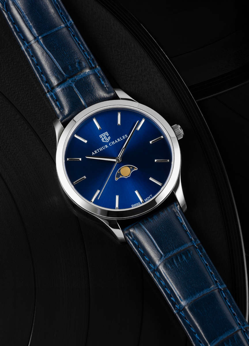 The Moonphase collection demonstrates Arthur Charles' commitment to quality and affordability. This exquisite collection, featuring the renowned Swiss Ronda movement, boasts an indulgent Italian leather strap fastened with a refined butterfly clasp. With a resolute focus on classical luxury, this watch is the perfect representation of Arthur Charles' caliber of craftsmanship.